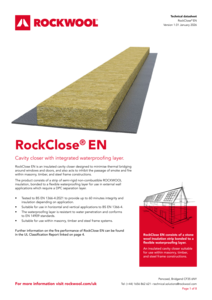 RockClose® EN is an insulated cavity closer designed to minimise thermal bridging around windows and doors. It also acts to inhibit the passage of smoke and fire within masonry, timber, and steel frame constructions.